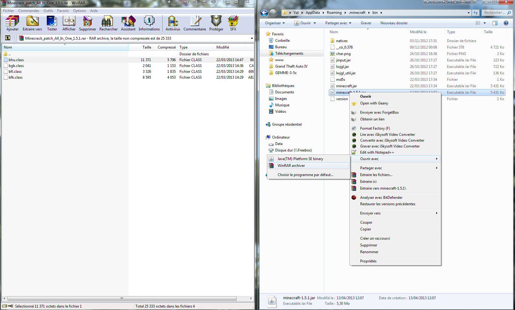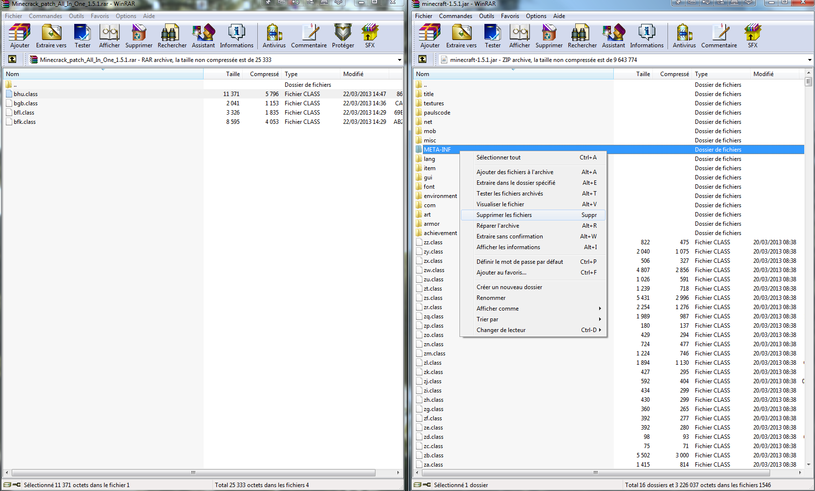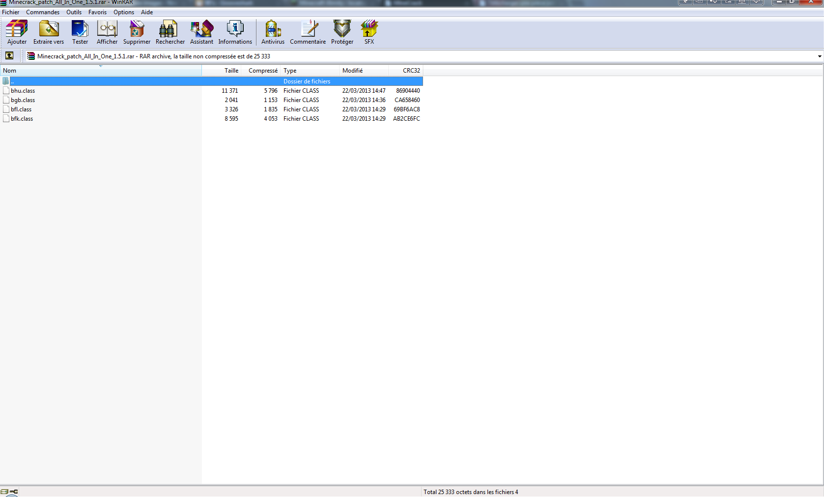 Et sélectionner les 4 fichiers du contenu téléchargé, pour les faires glisser/déplacés dans le minecraft-1.5.1.jar ouverts avec winrar