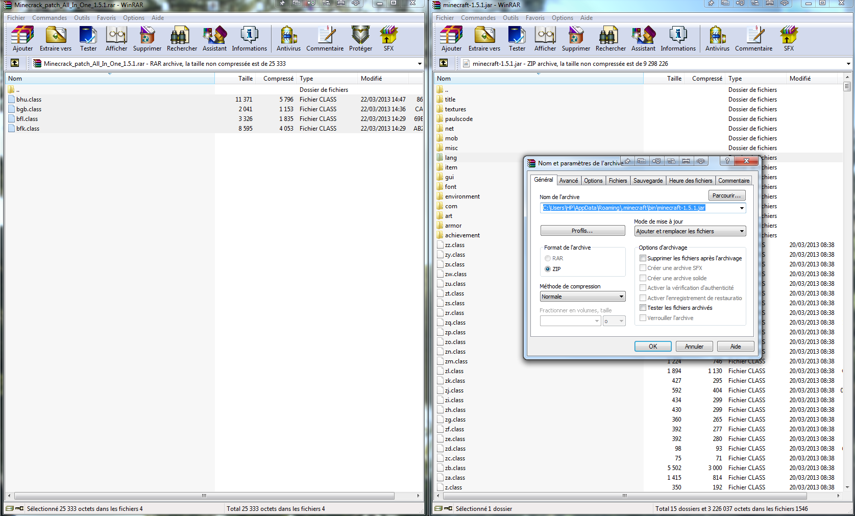Et sélectionner les 4 fichiers du contenu téléchargé, pour les faires glisser/déplacés dans le minecraft-1.5.1.jar ouverts avec winrar
