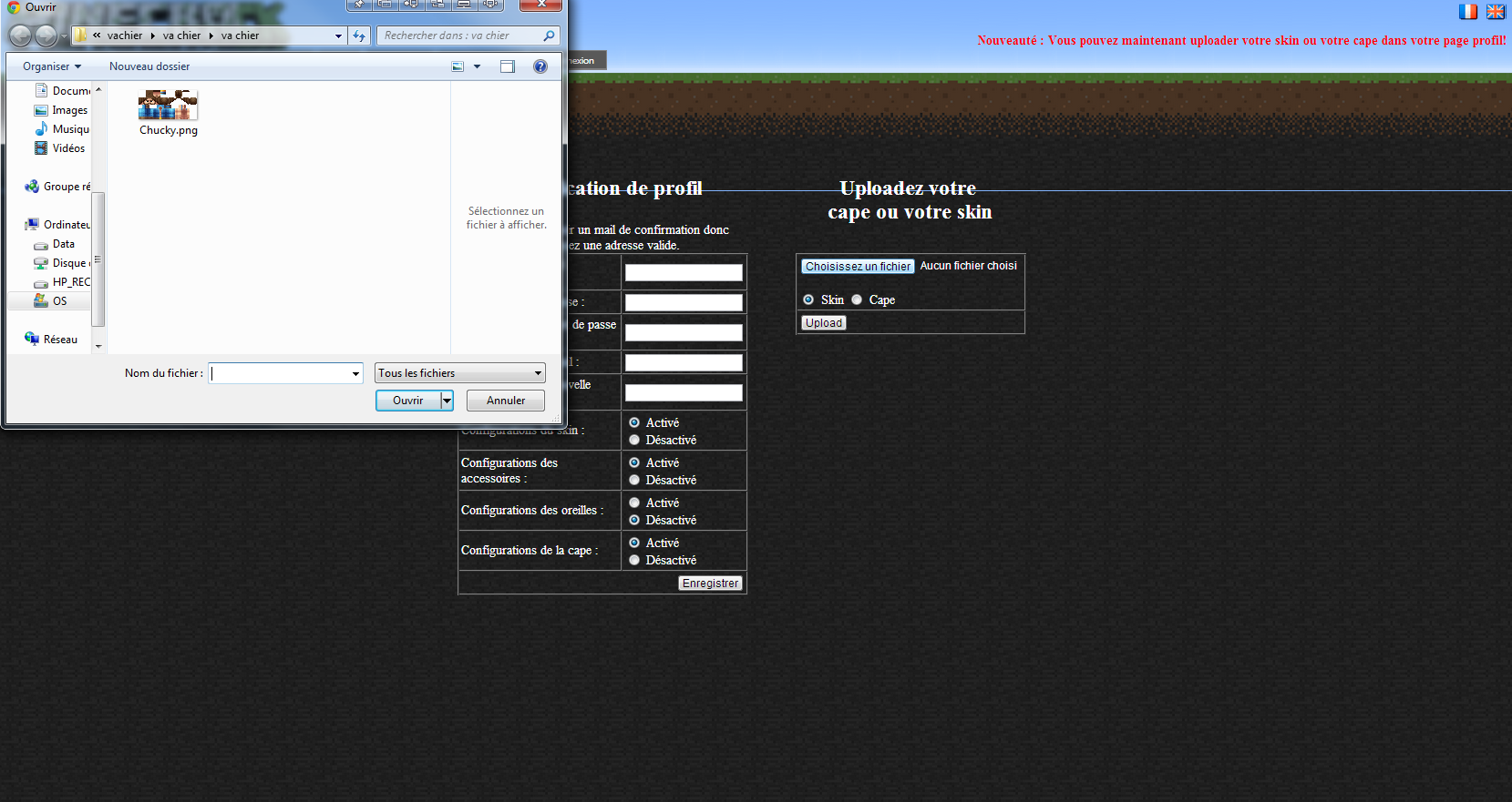Puis ajouter le sur minecrack, en cliquant sur "choisissez un ficher", et en cochant skin si c'est un skin que vous souhaitez ajouter ou une cape si gnagnagna