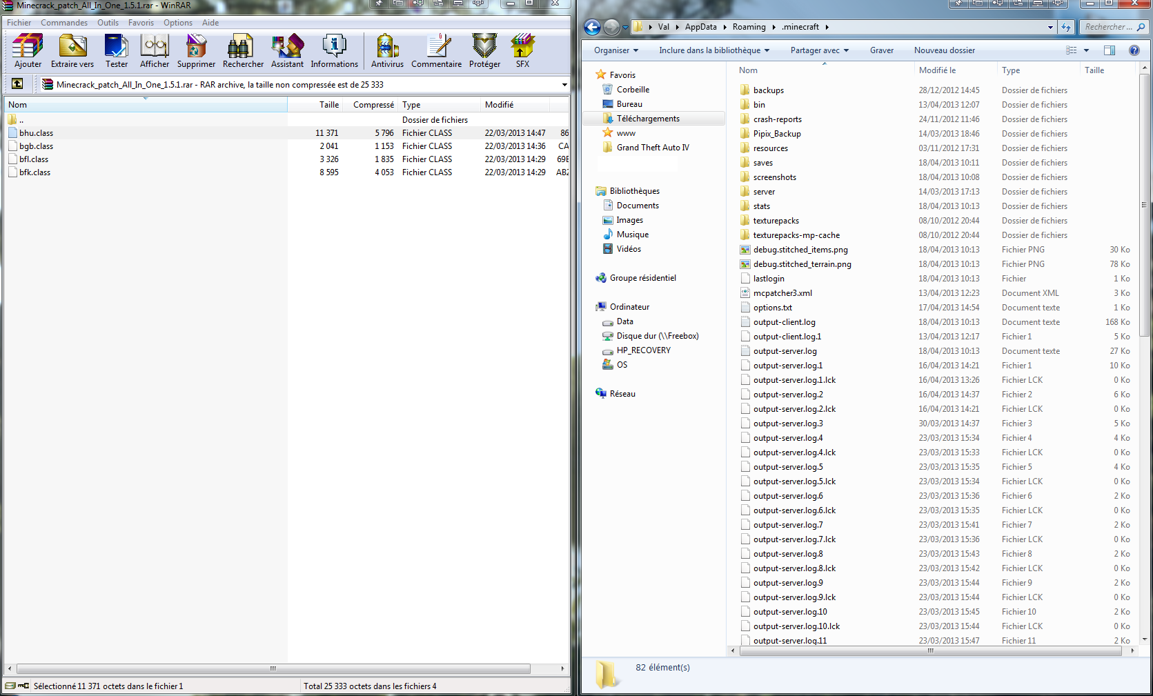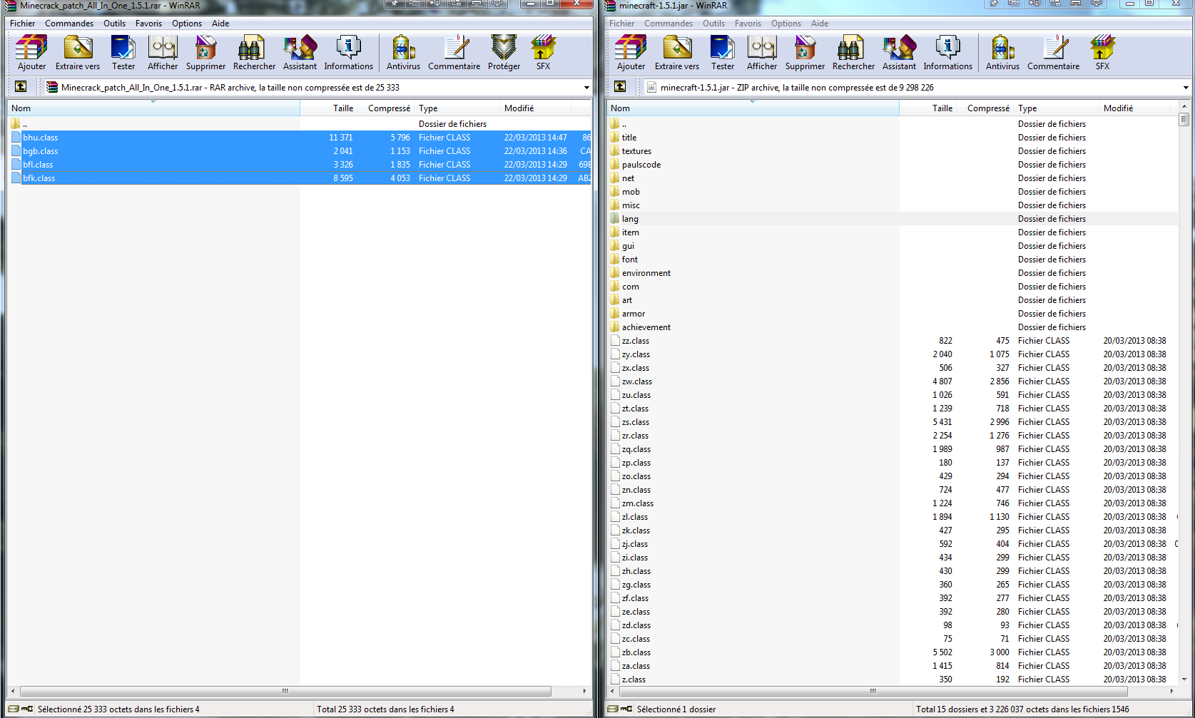Et sélectionner les 4 fichiers du contenu téléchargé, pour les faires glisser/déplacés dans le minecraft-1.5.1.jar ouverts avec winrar